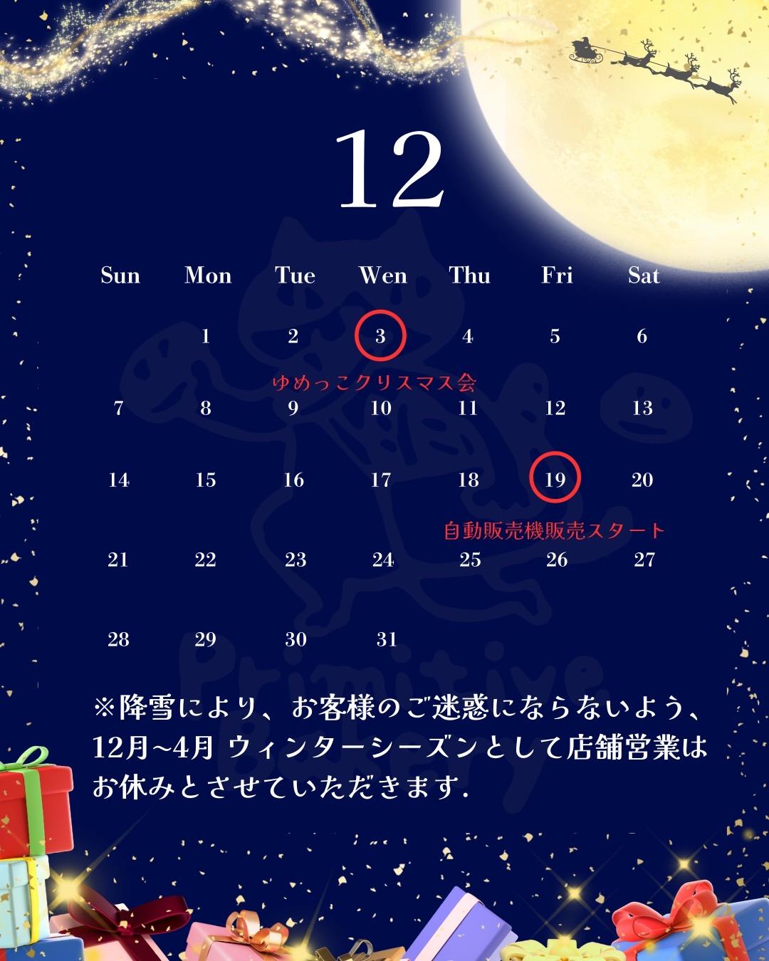 ぷりみてぃぶ12月の営業今年は降雪時のお客様のお車でのご来店心配、店主の家事都合もあり、12月から翌年4月までの店舗営業はお休みにさせていただきました。
